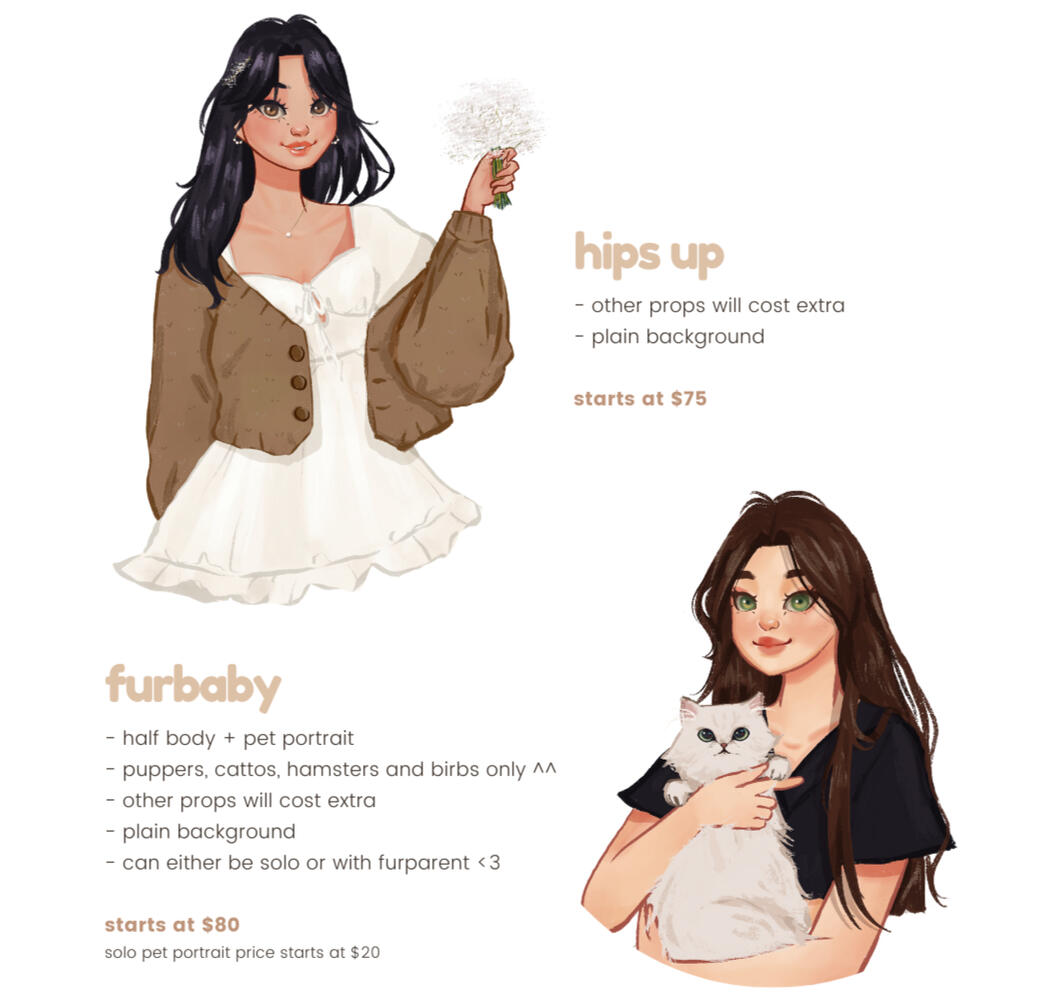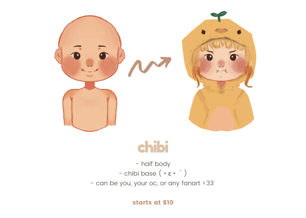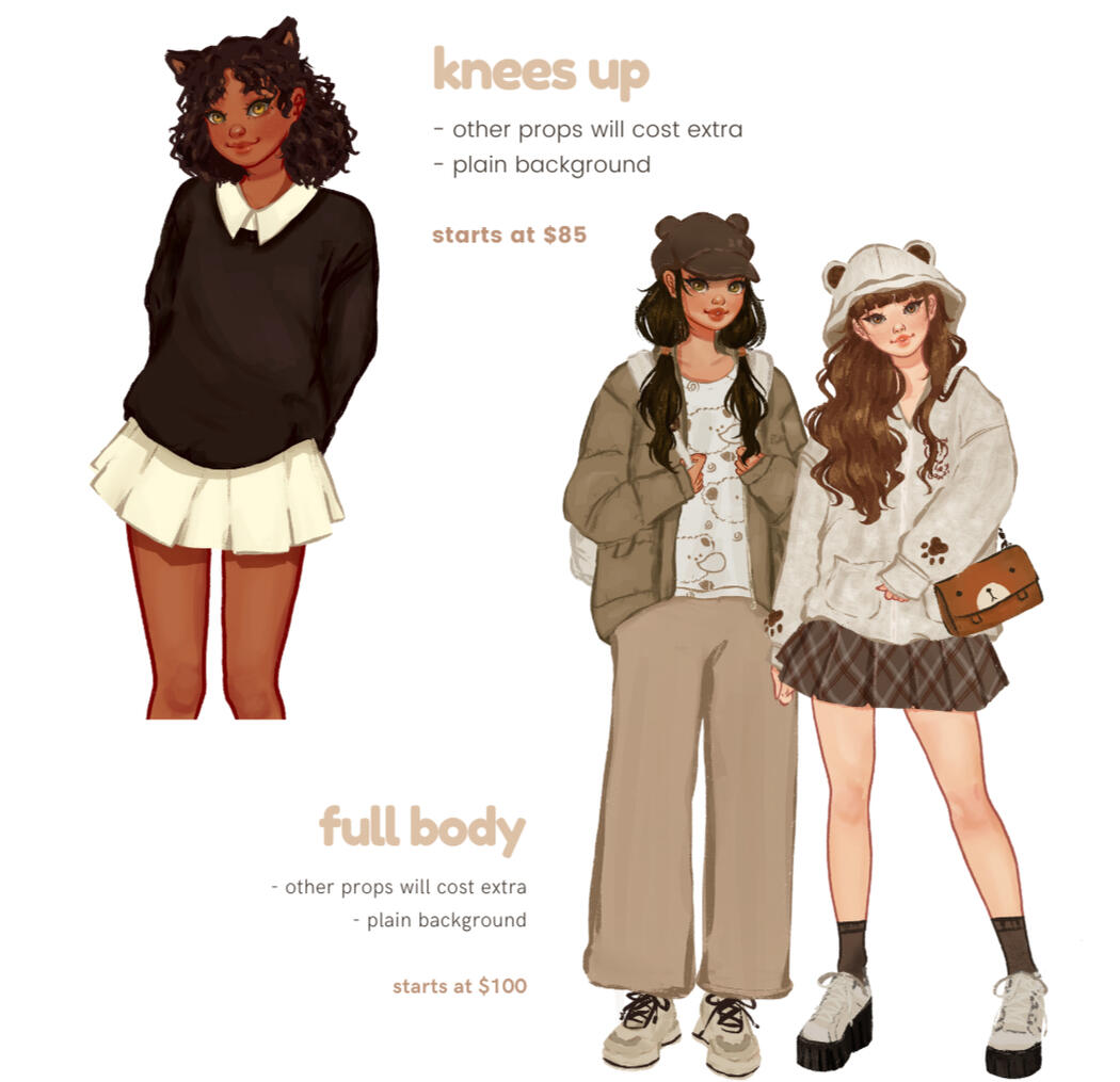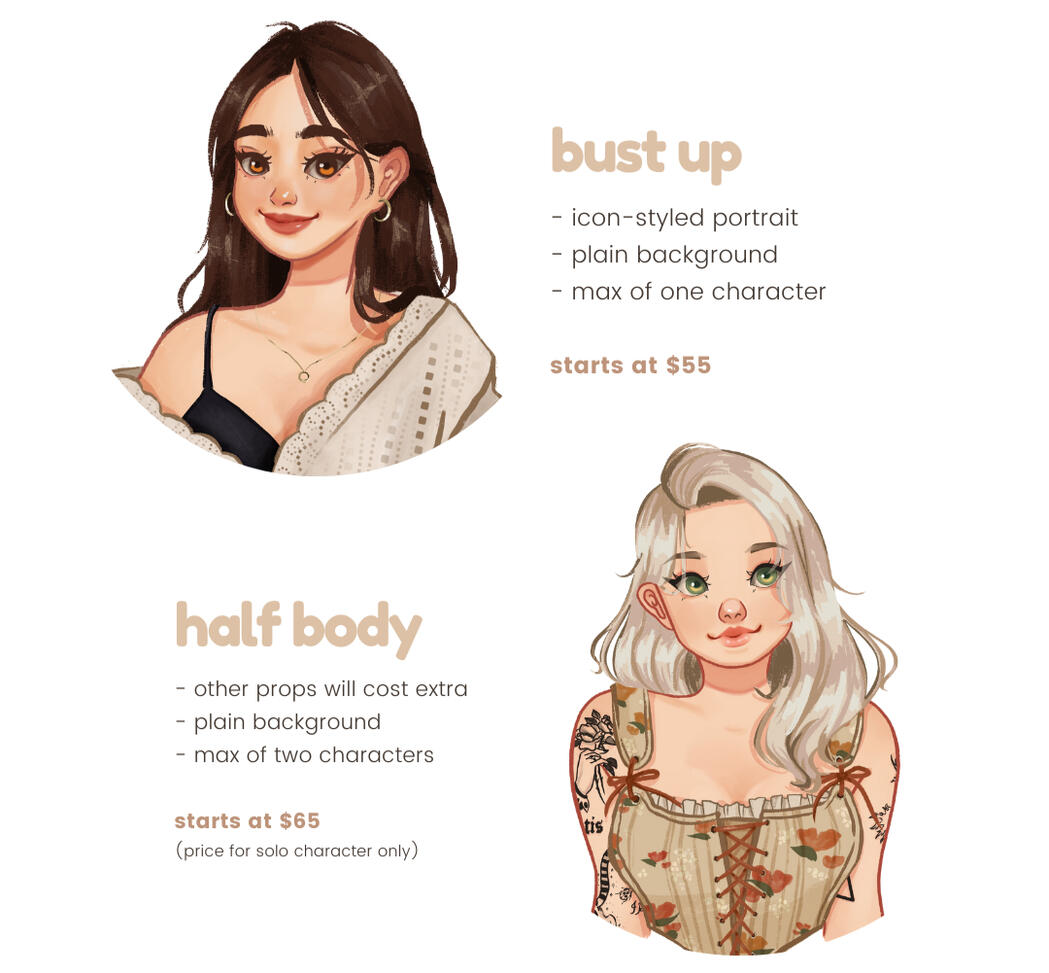 1. Art type: Bust Up, Half Body, Hips Up, Knees Up, Full Body, or Chibi (please refer to rates)