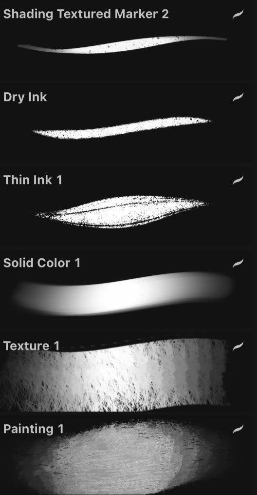here are my go to brushes :>- shading textured marker for clothing and other shaded textures
